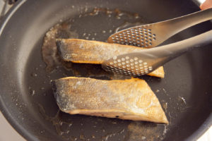 鮭は焼き色がしっかりつくまであまり触らないようにします。