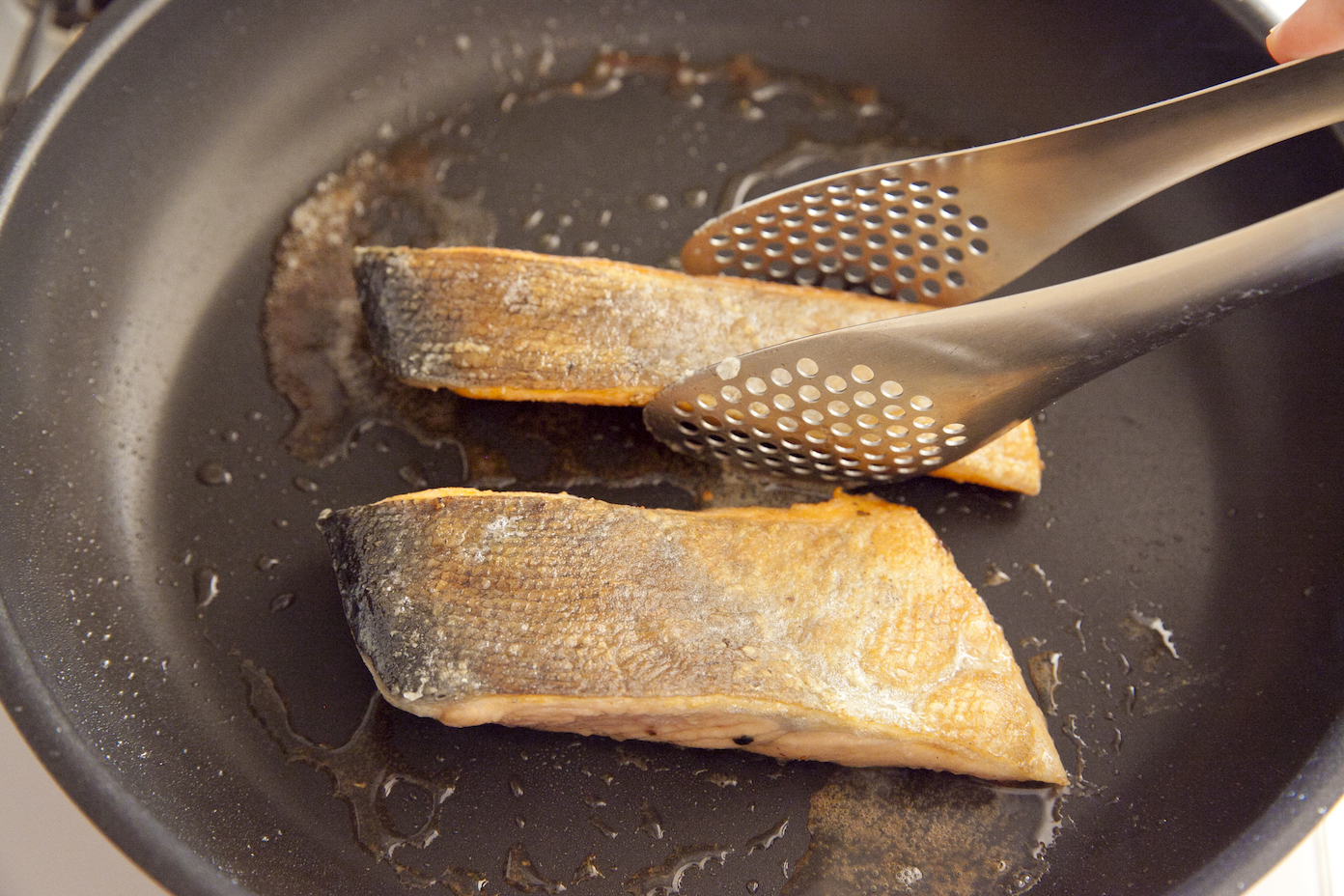 鮭は焼き色がしっかりつくまであまり触らないようにします。