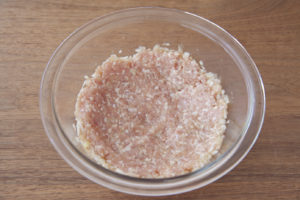 耐熱ボウルに鶏ひき肉、玉ねぎ、ラカントS顆粒、ナンプラー、すりおろしにんにく、一味唐辛子を入れて混ぜ、