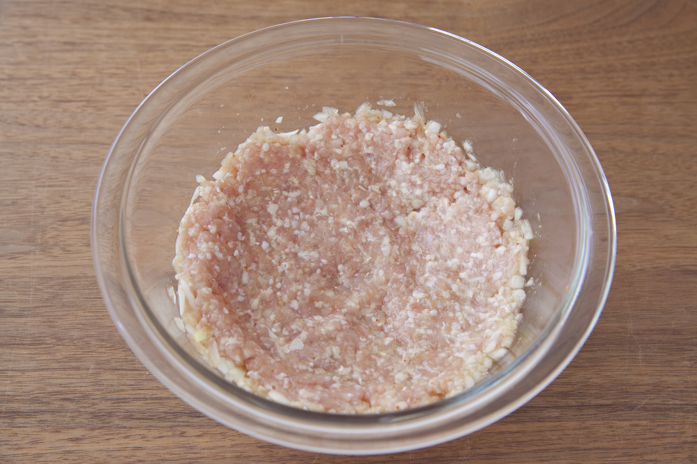 耐熱ボウルに鶏ひき肉、玉ねぎ、ラカントS顆粒、ナンプラー、すりおろしにんにく、一味唐辛子を入れて混ぜ、