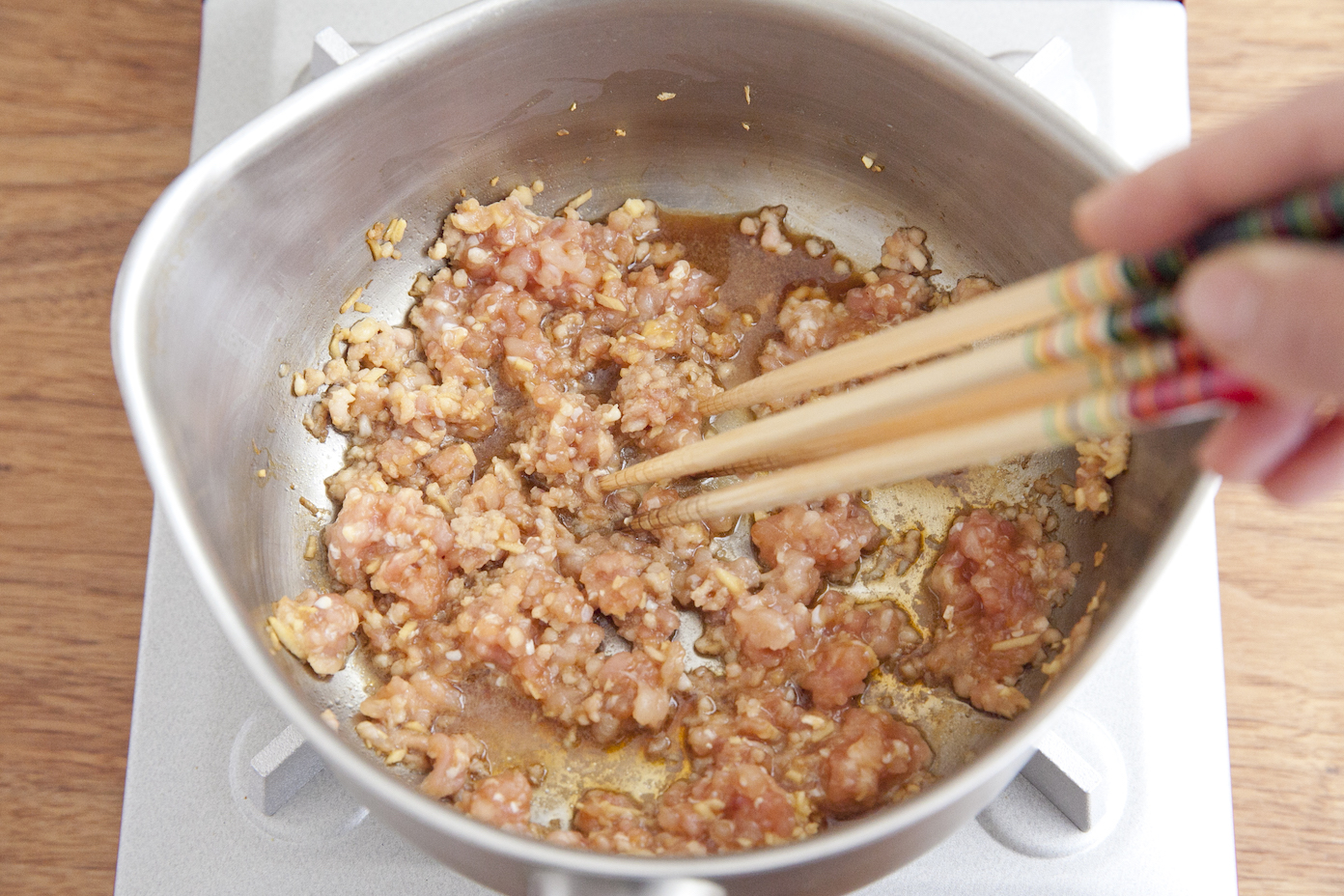 ★菜箸4本でかき混ぜることで、鶏ひき肉が固まらずにポロポロに仕上がります。