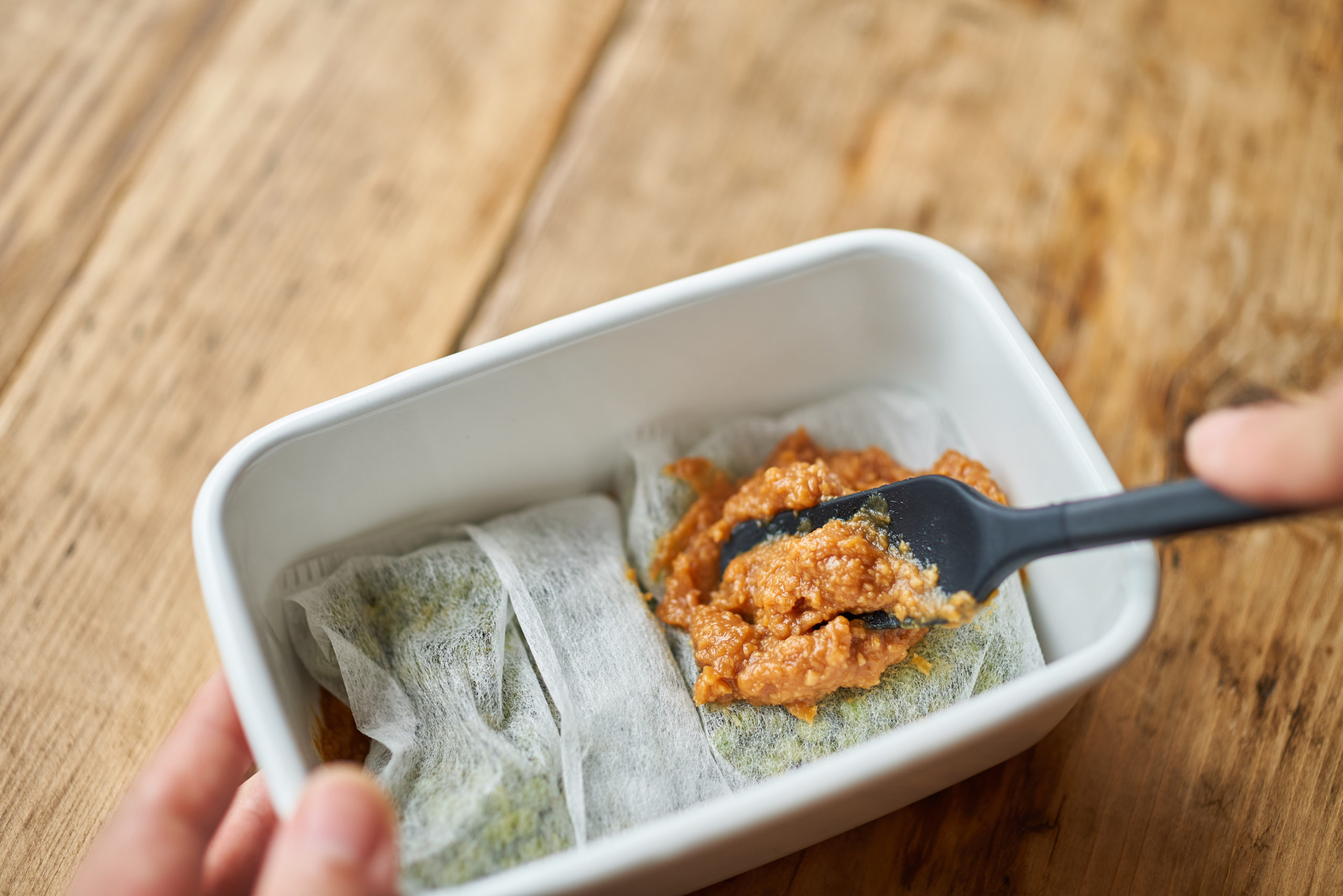 みそ、みりんを混ぜ、清潔な保存容器に半量いれる。