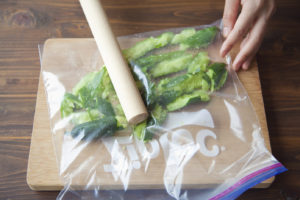 ジッパー付き保存袋にきゅうりを入れ、麺棒などで叩く。