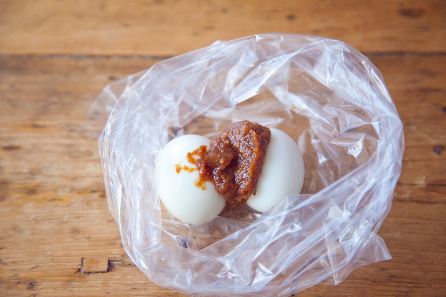 【1】ポリ袋に茹で卵、みそ、みりんをいれてなじませ、冷蔵庫で1日つける。