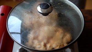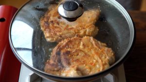 裏返して蓋をしたまま2分半加熱し、火を止めてそのまま2分おき余熱で火を通す。
