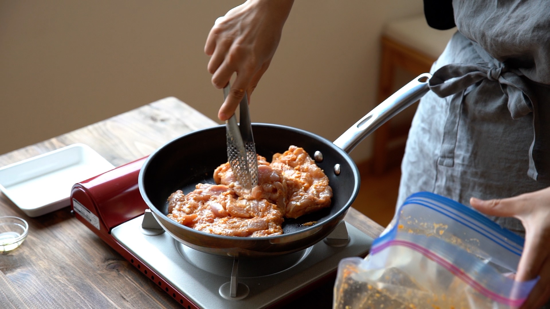 フライパンにオリーブオイルを熱し、鶏肉を皮目を下にして入れ、蓋をして弱めの中火で5分加熱する。