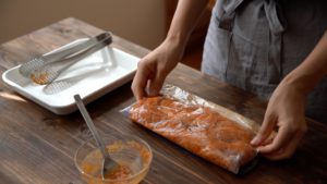 ジッパー袋に鶏もも肉、みそ床を入れて全体に混ざるように揉み込み、