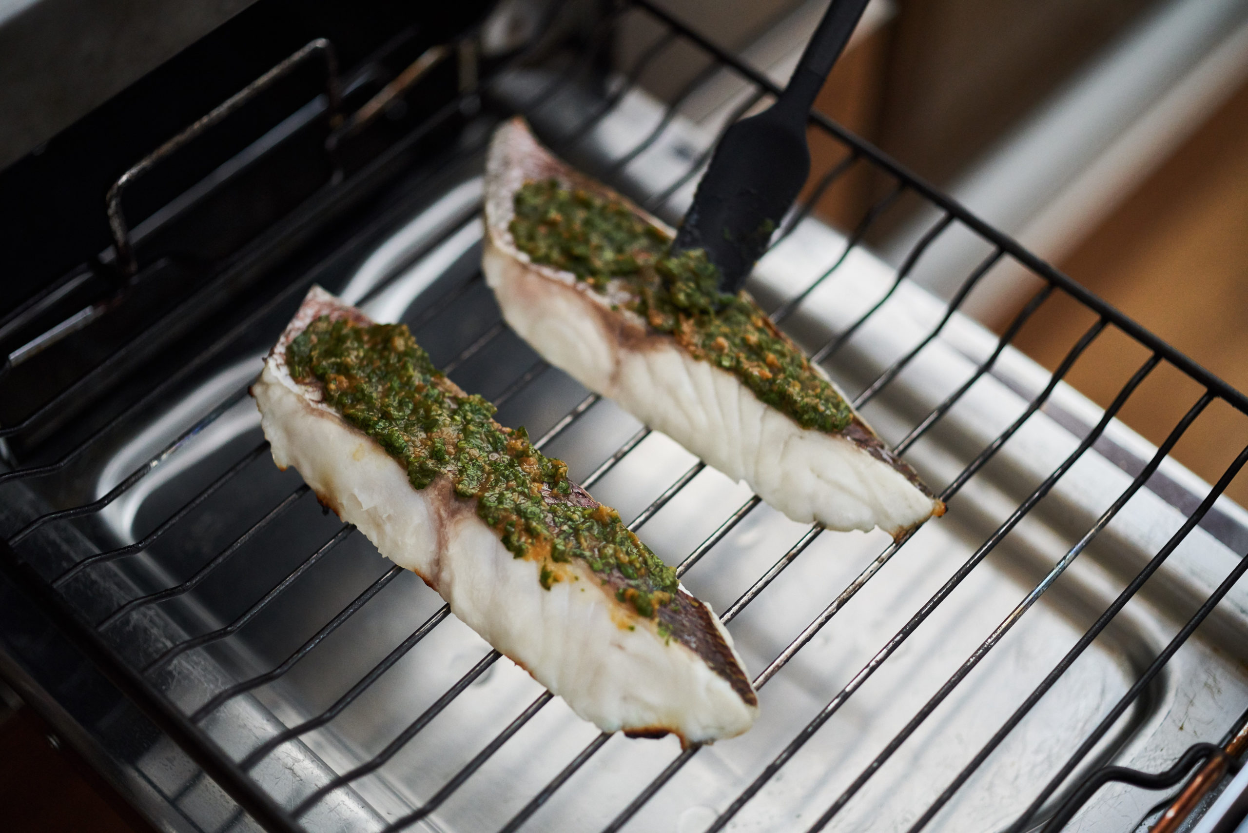 魚焼きグリルに入れて3分ほど焼き、みそだれをのせてさらに3分ほど焼く。