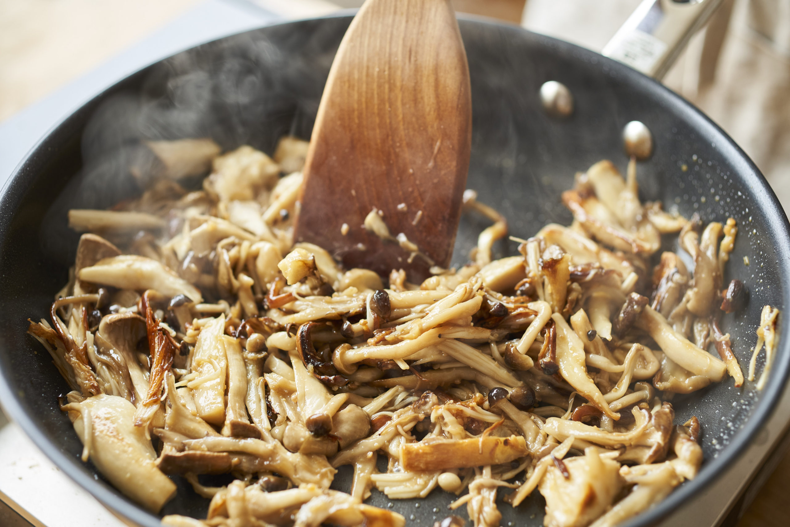 きのこに焼き目がつくまで触らずにおき、焼き色がついたら全体を炒め合わせる。
