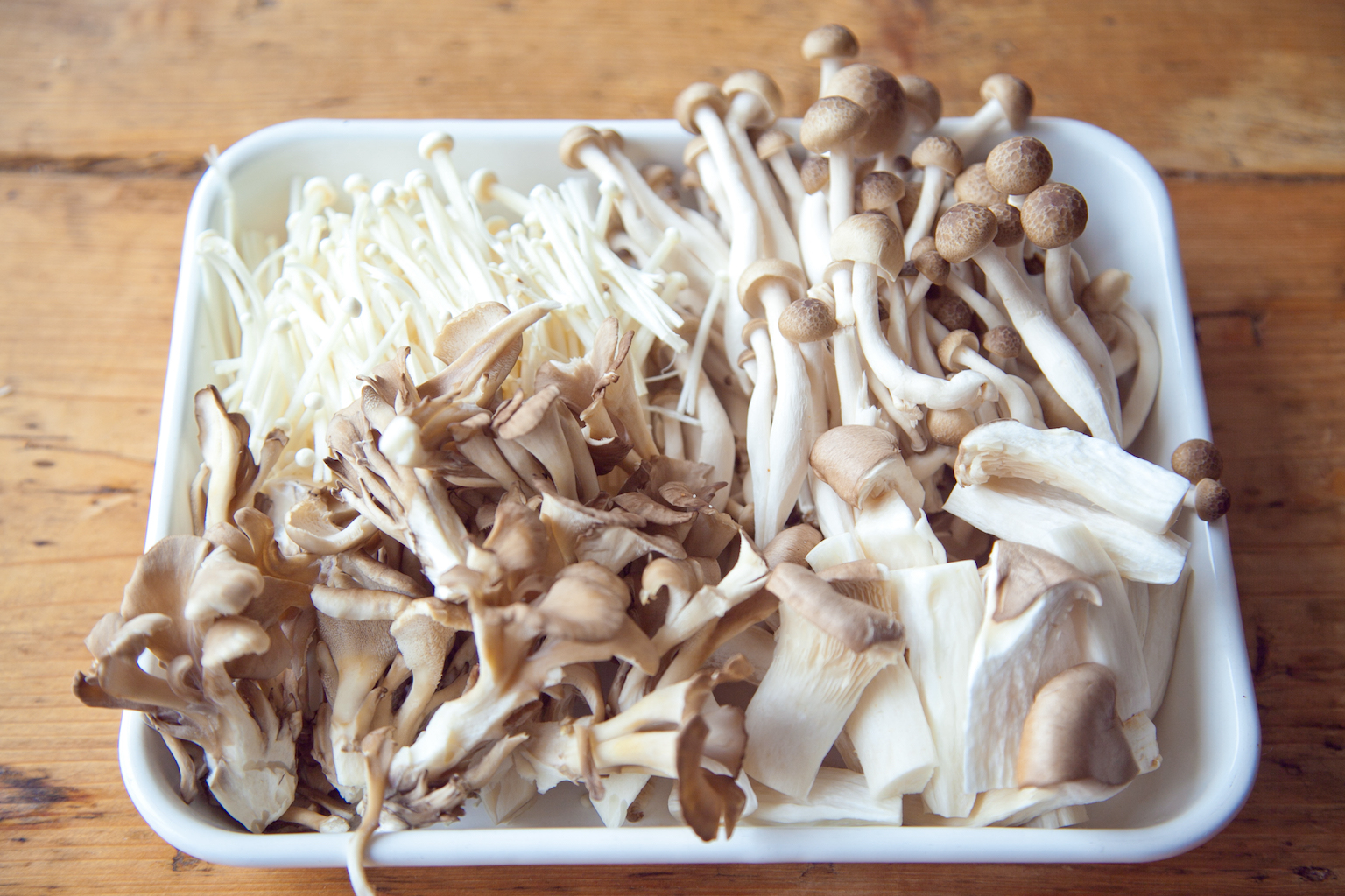 まいたけは手でほぐす。えのきは石づきを切り取り、長さを半分に切って手でほぐす。