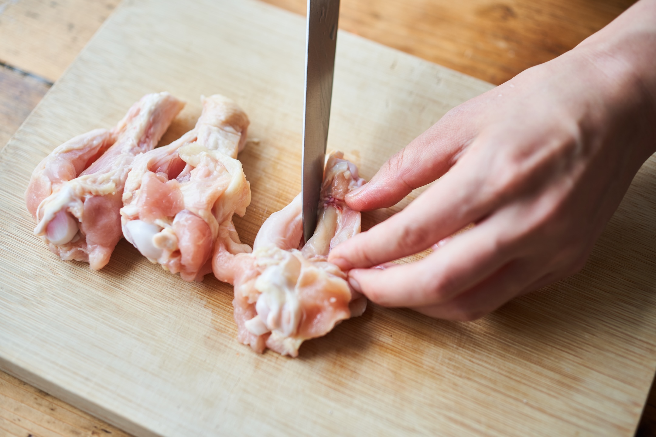 手羽元は骨にそって切り込みをいれて、塩こしょうを揉み込む。