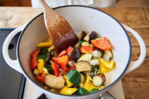 玉ねぎがしんなりしたら、なす、ズッキーニ、パプリカを加え、