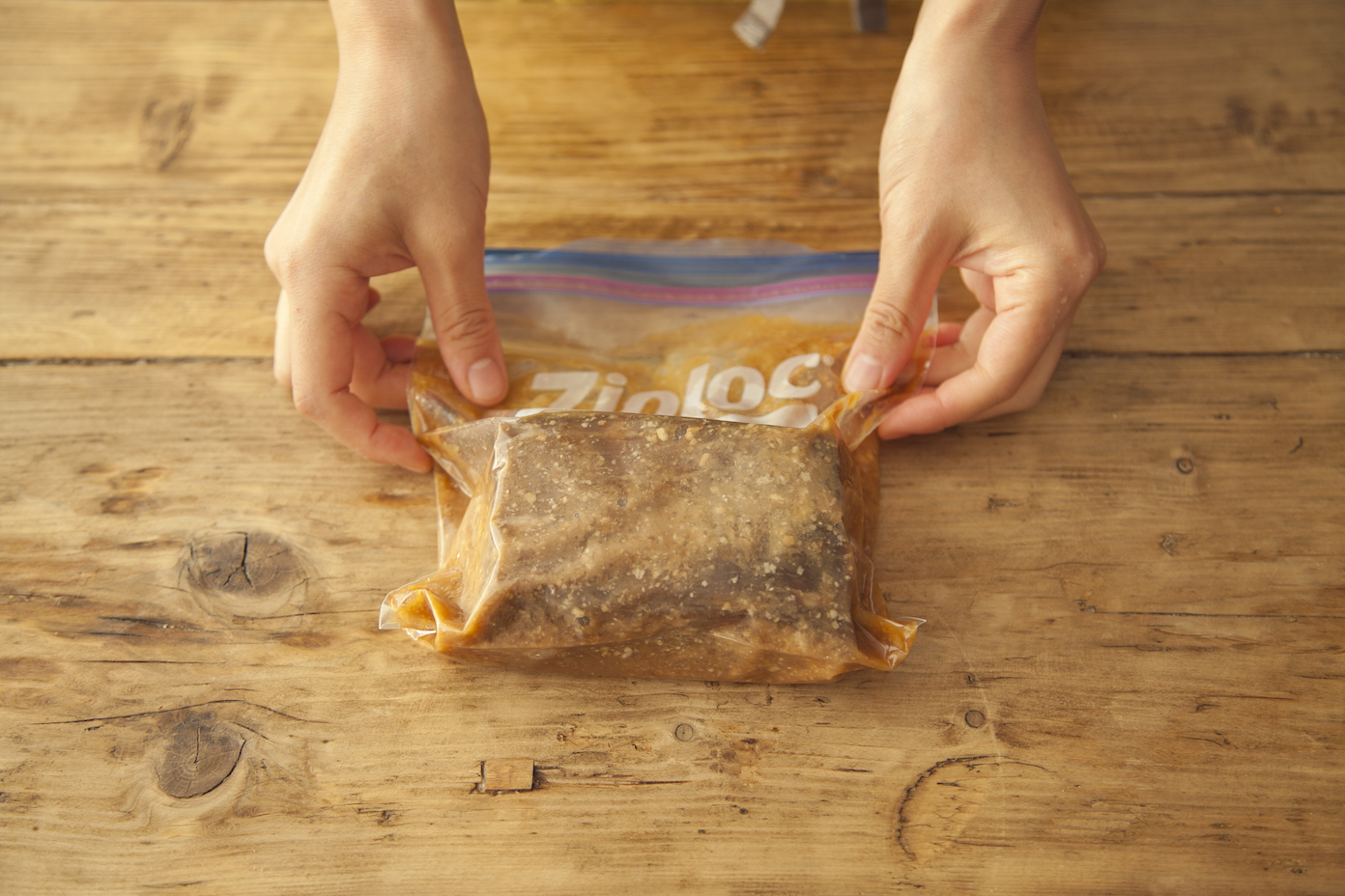 ジッパー付き保存袋に(A)を入れて混ぜ、牛肉をいれてなじませて、