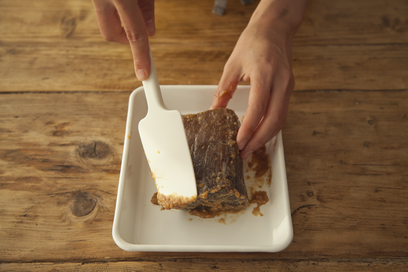たれをゴムベラなどでしっかり拭う。(たれは取っておく。)