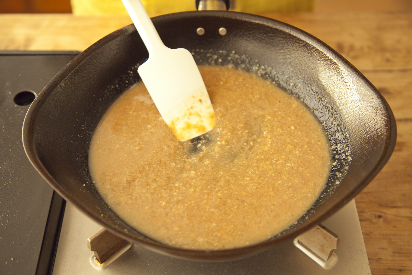 フライパンを洗い、漬けだれ、水1/4カップを入れて弱めの中火にかけ、