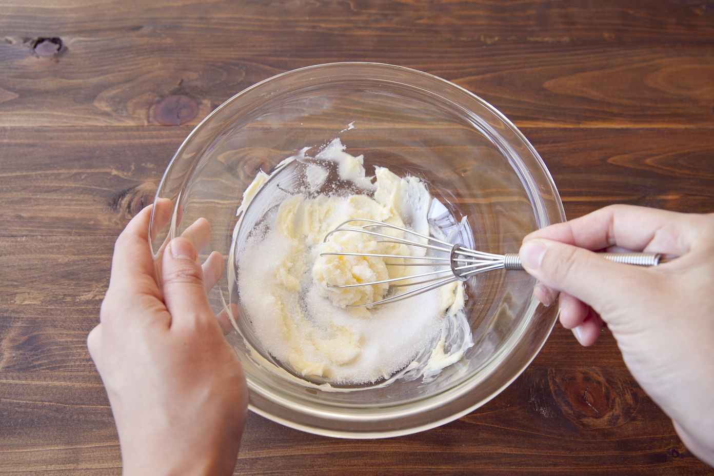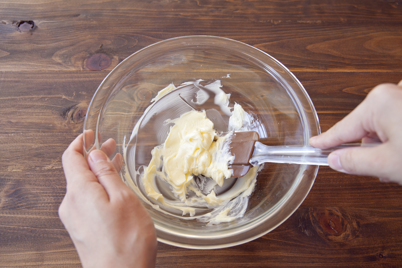 【1】ボウルにバターを入れ、クリーム状になるまでゴムベラで練る。