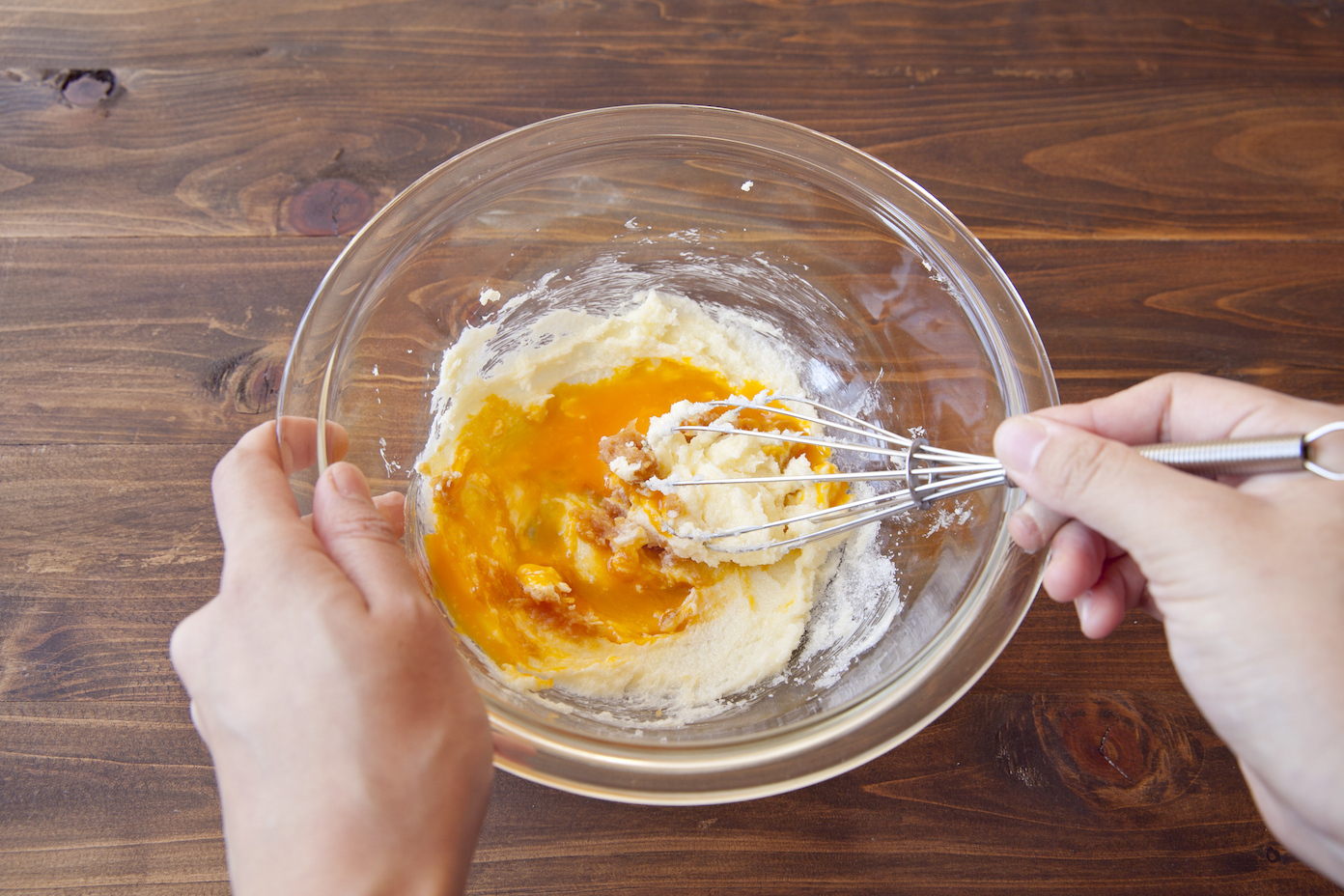 グラニュー糖を加えて泡立て器ですり混ぜる。卵黄、みそを加え混ぜる。