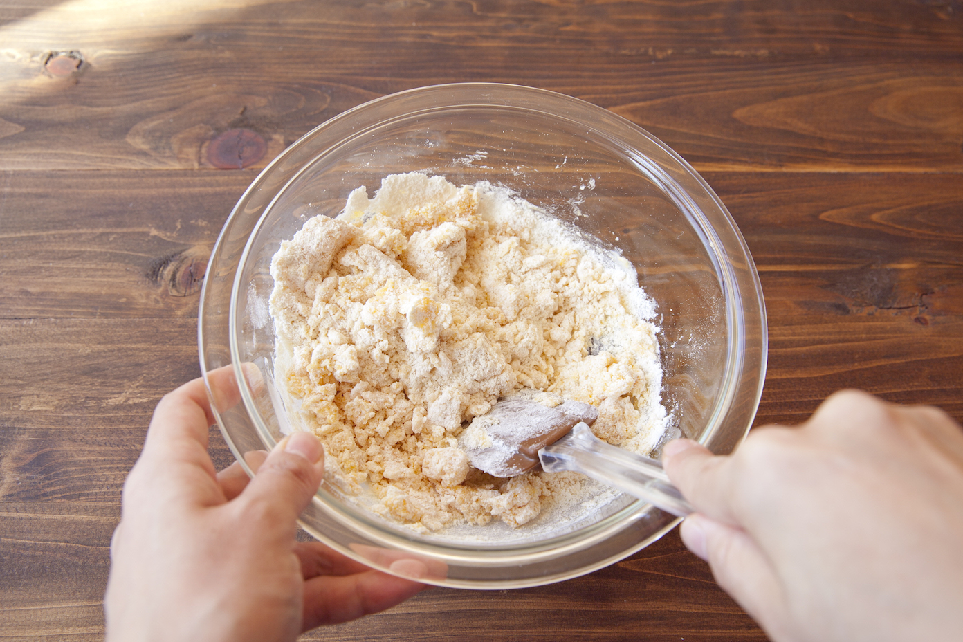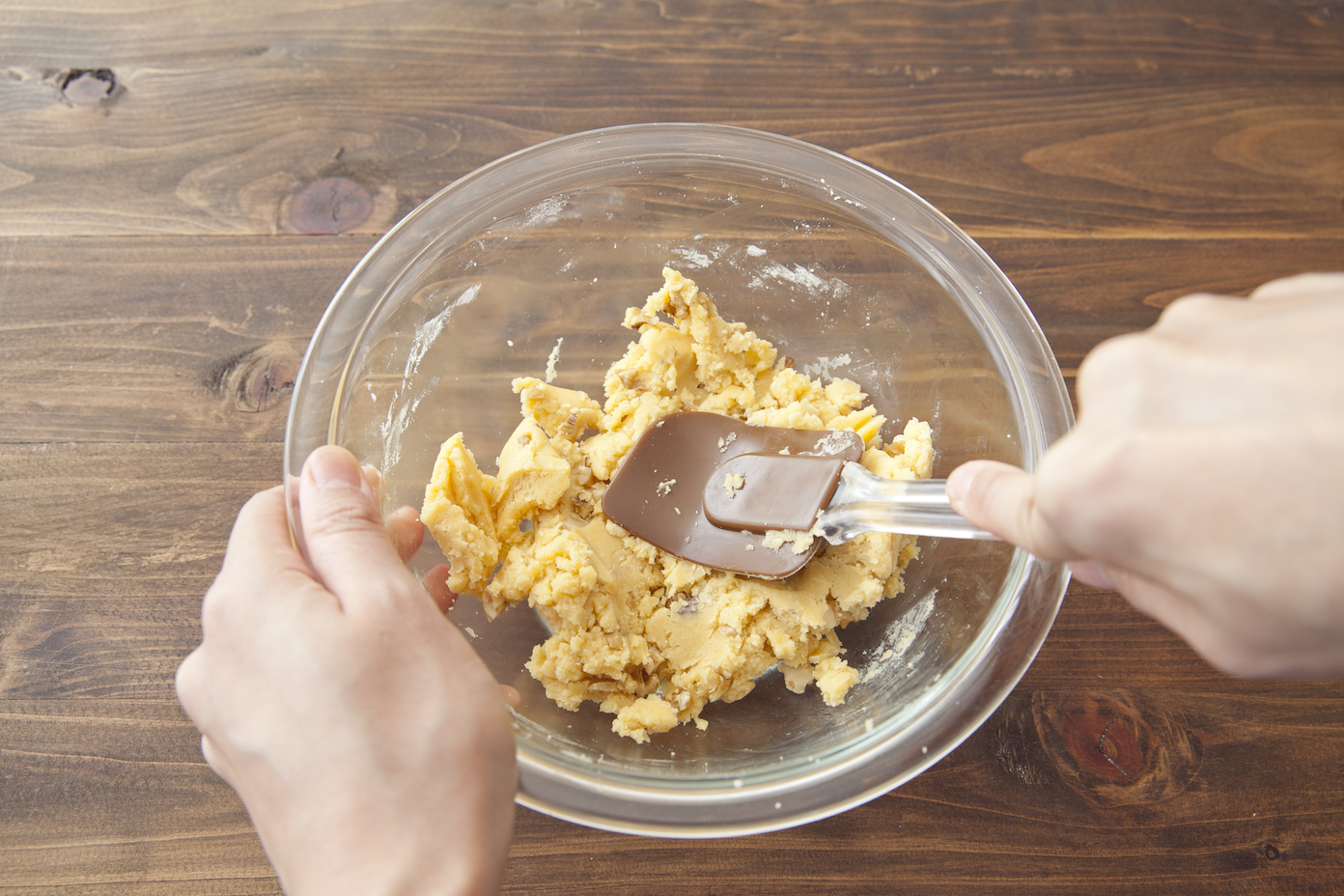 【2】薄力粉、アーモンドパウダーを加え、ゴムベラで切るように混ぜ、パラパラとしてきたらくるみを加え混ぜる。ゴムベラで押し付けるようにしてひとまとめにする。
