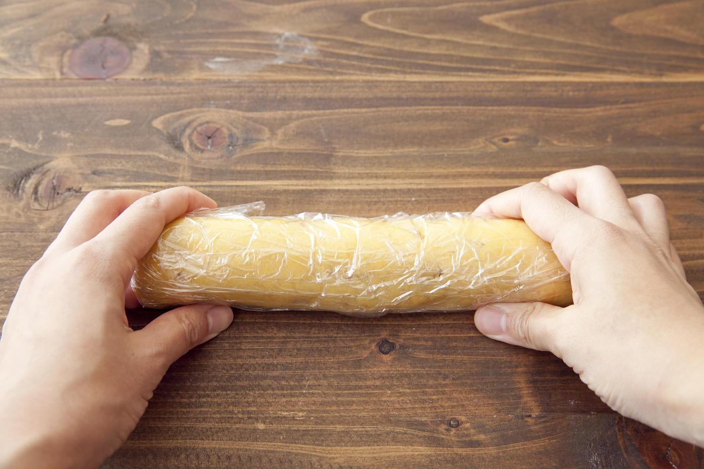 【3】20cm程度の長さの棒状にしてラップで包み、冷蔵庫で1時間以上寝かせる。