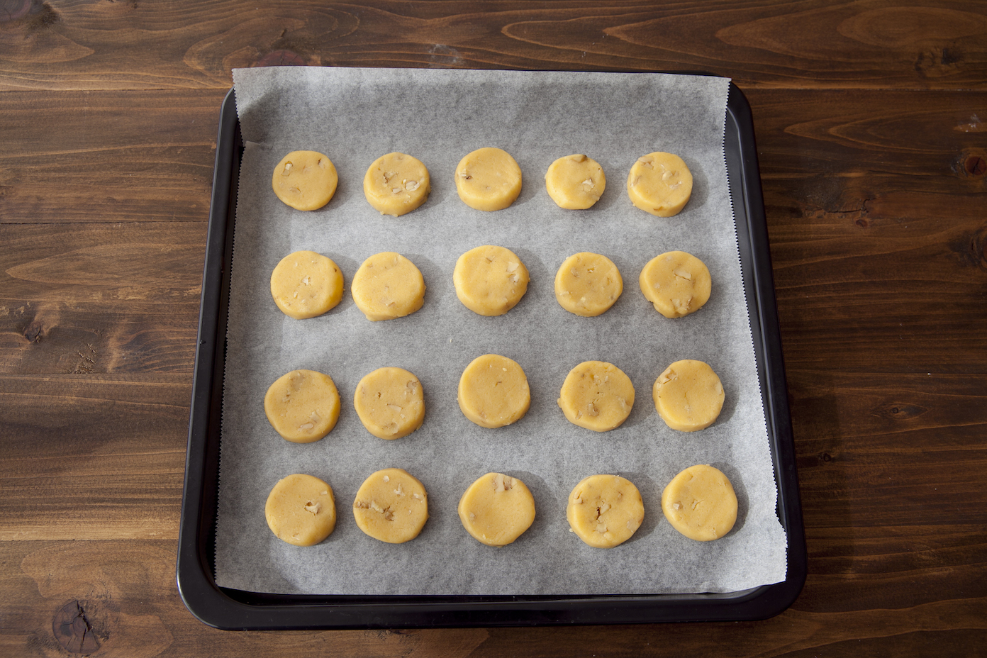 包丁で1cm程度の厚さに切り、形をととのえてクッキングシートを敷いたオーブン皿にのせ、