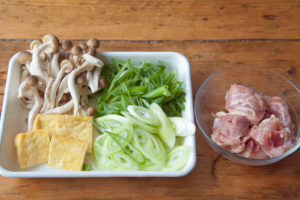 鶏肉を入れて中火にかけ、煮たったら長ねぎ、しめじ、油揚げを入れて 3〜4 分煮る。
