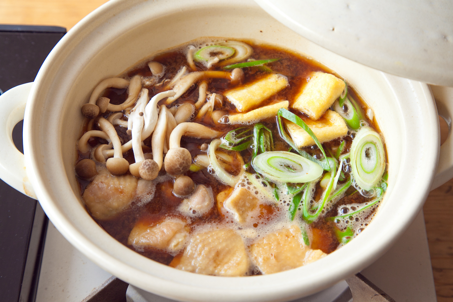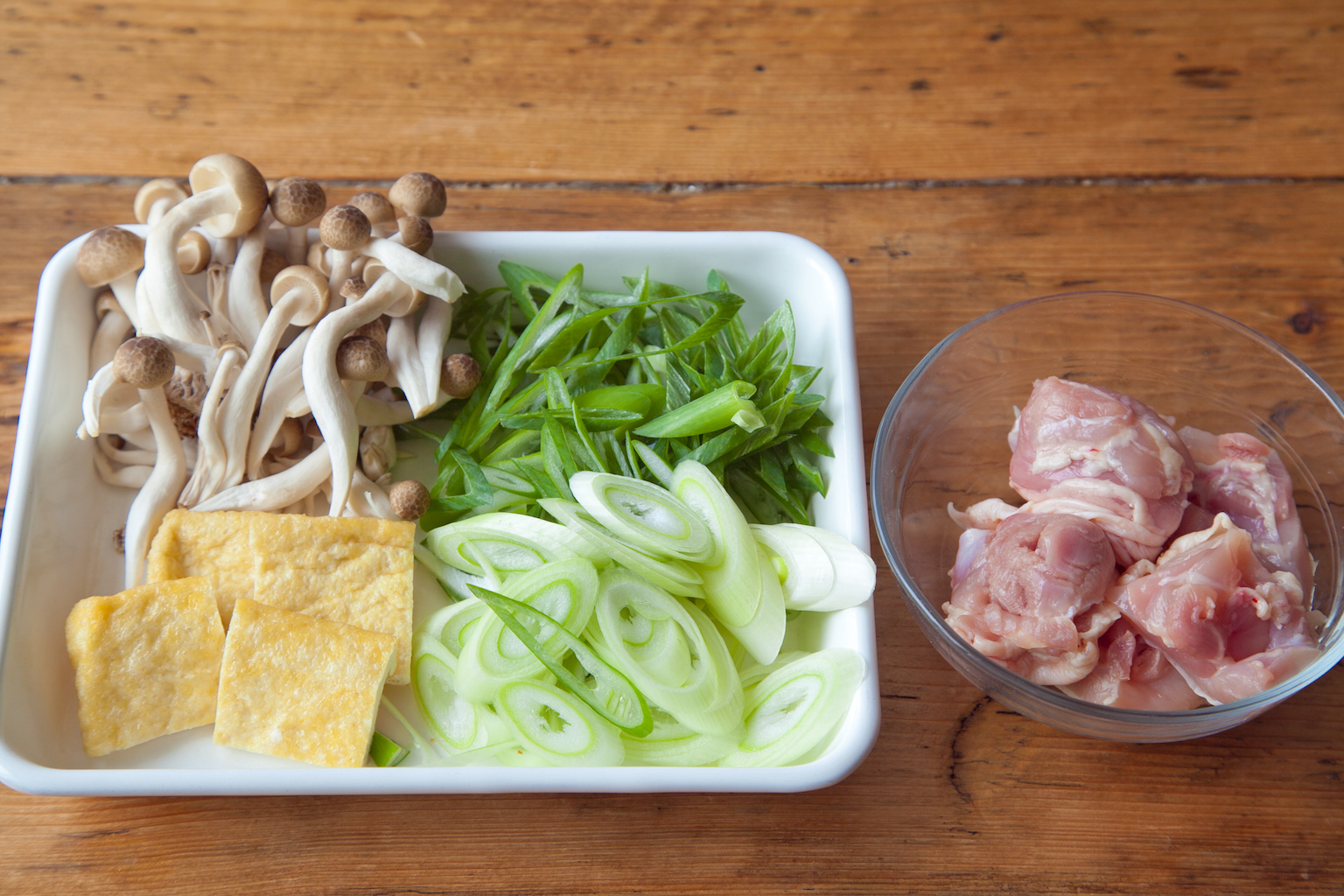 鶏肉を入れて中火にかけ、煮たったら長ねぎ、しめじ、油揚げを入れて 3〜4 分煮る。