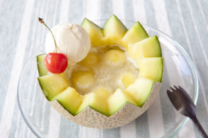 【2】メロンの種を取り除き、果肉をくり抜きメロンカップを作る。