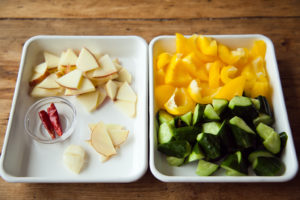 きゅうり、パプリカは乱切り、りんごは皮付きのまま縦半分に切って横薄切りにする。