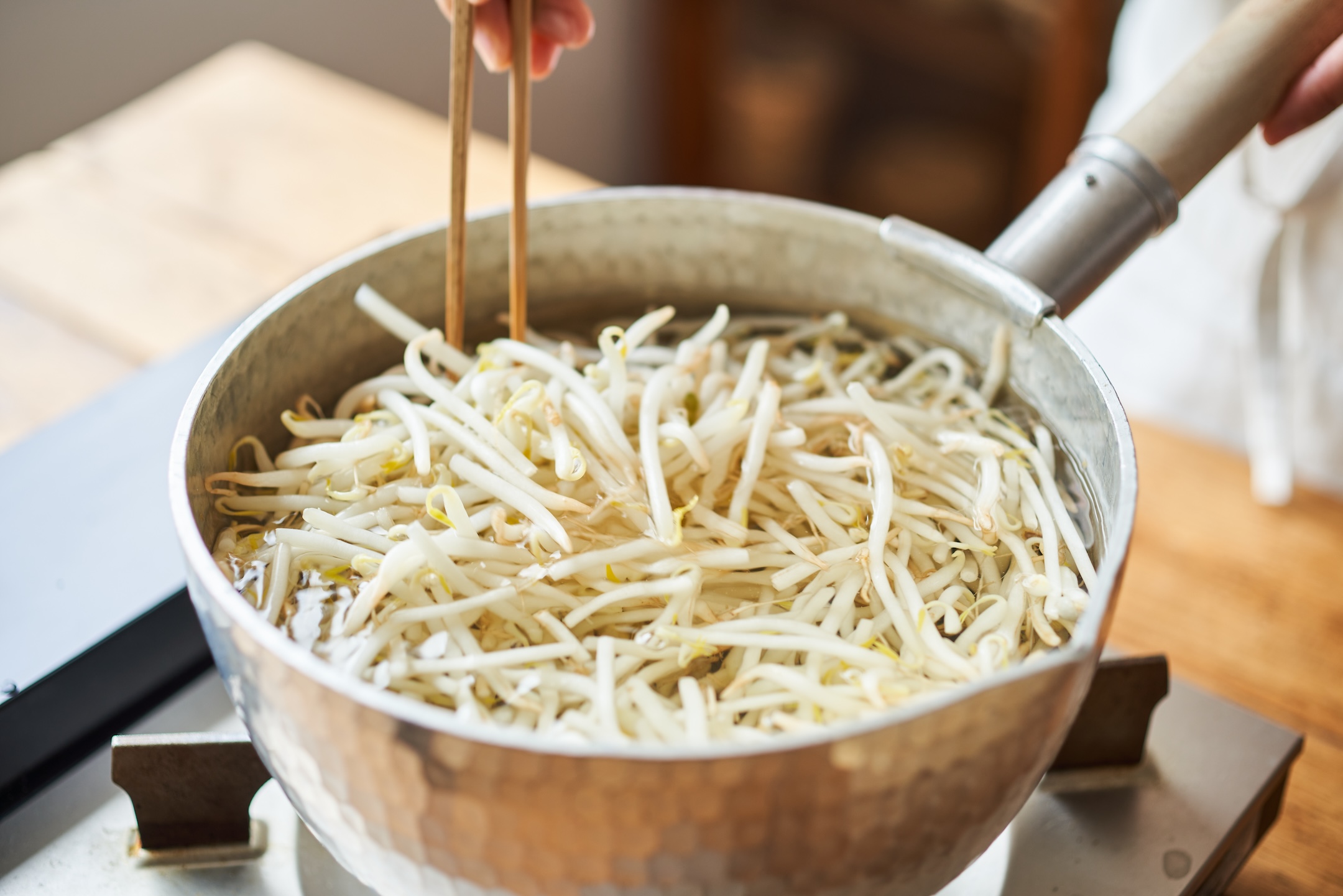 鍋にたっぷりの湯を沸かしもやしを1分ほど茹でる。