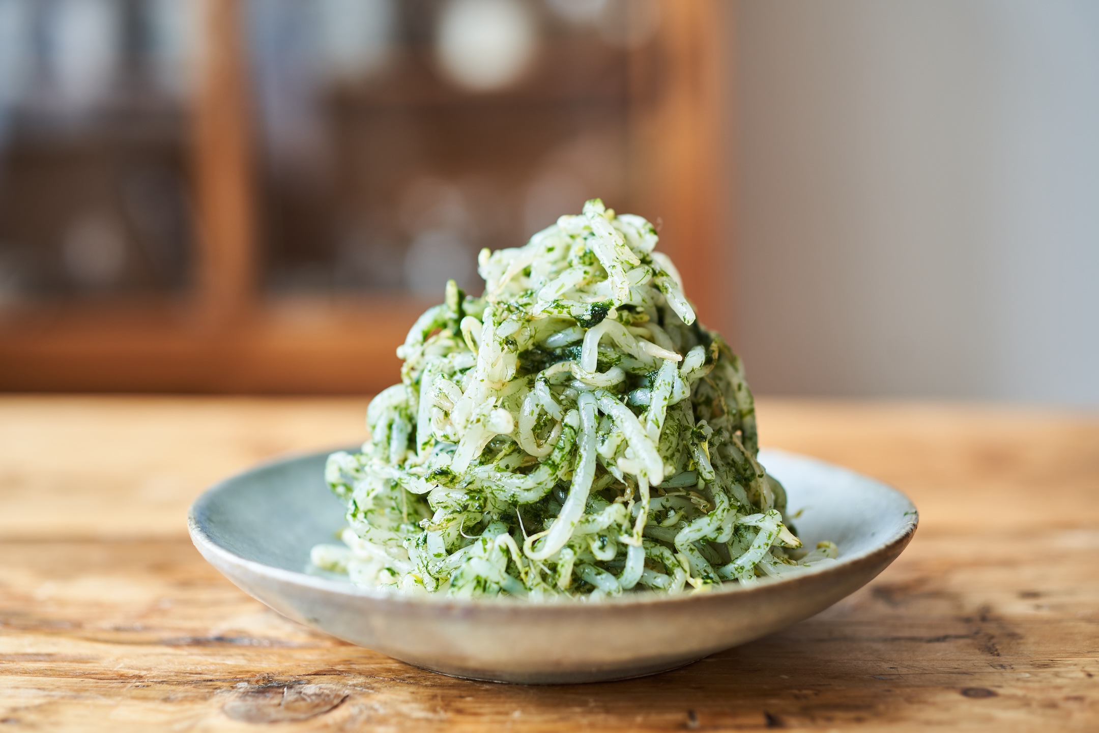 ざるにあげ、流水をかけて冷まししっかり水を絞る。