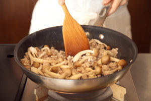 フライパンにサラダ油を熱し、鶏肉を炒める。