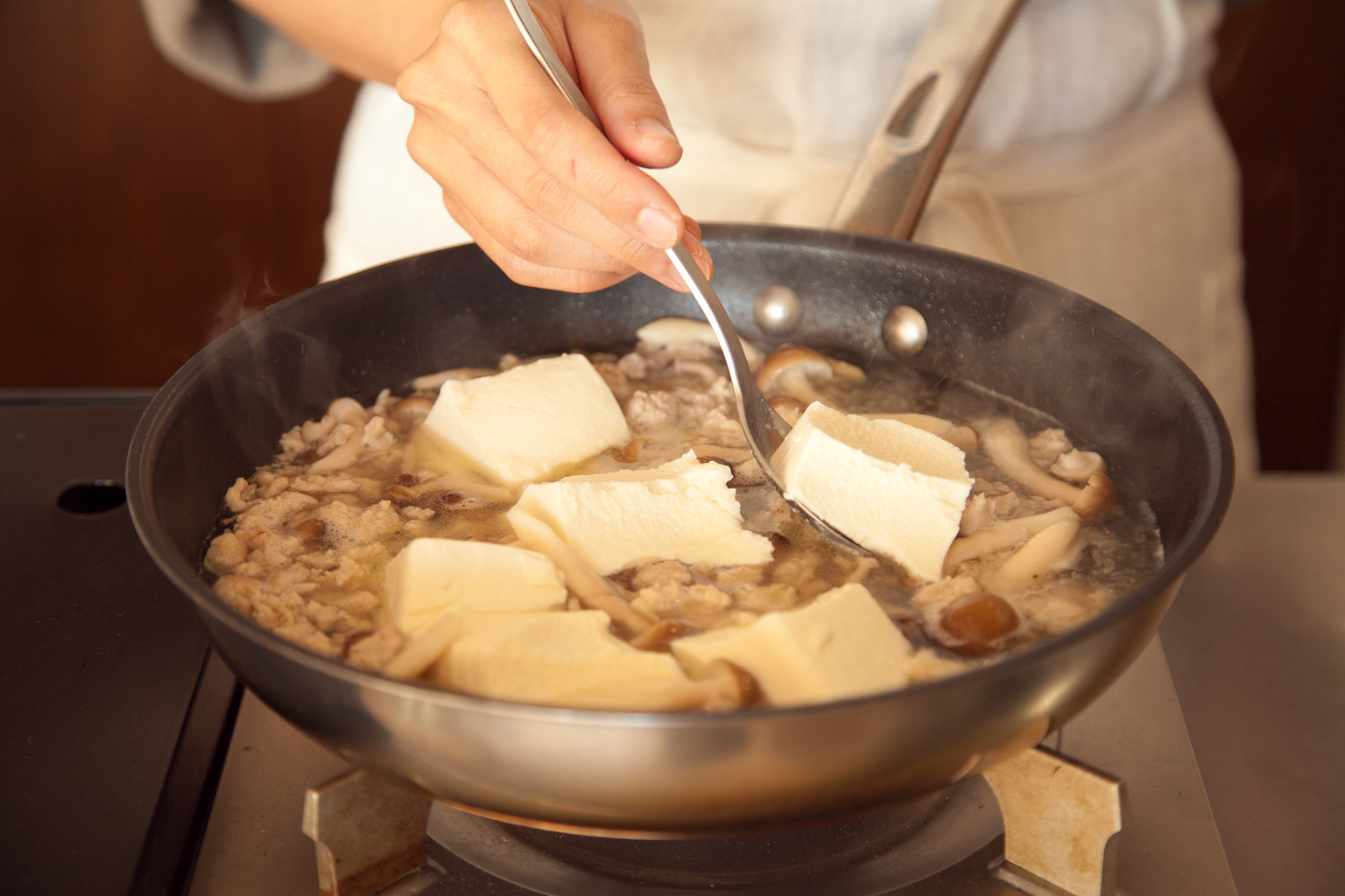 煮立ったら豆腐をスプーンですくい入れ、温まったら(A)を加え、