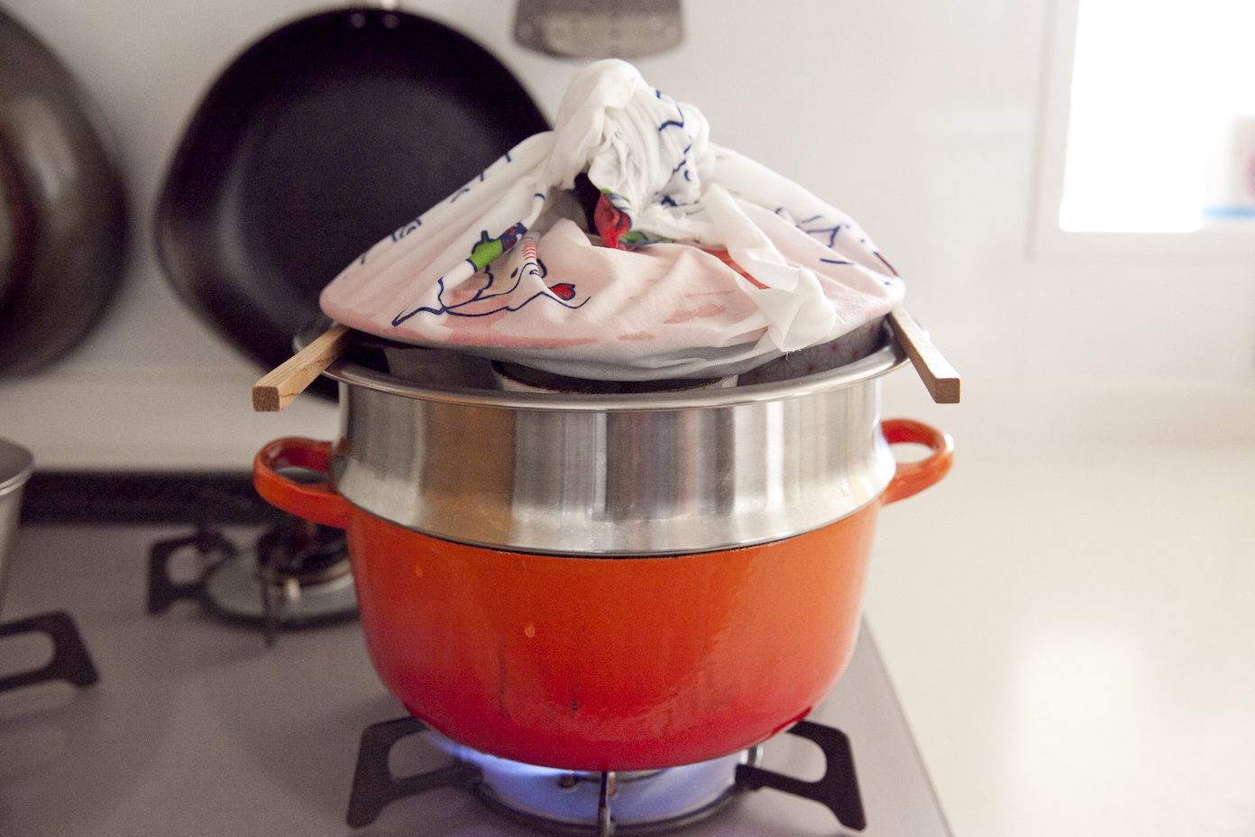 蒸し器の蓋にふきんを結び水滴が落ちないようにする。