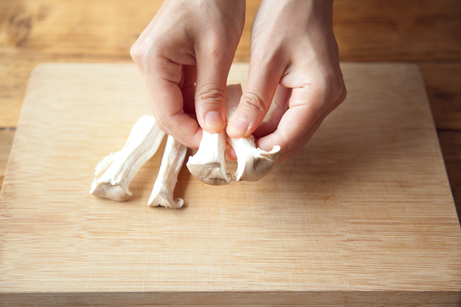 エリンギは硬い部分を切り落とし、縦1/4にさく。