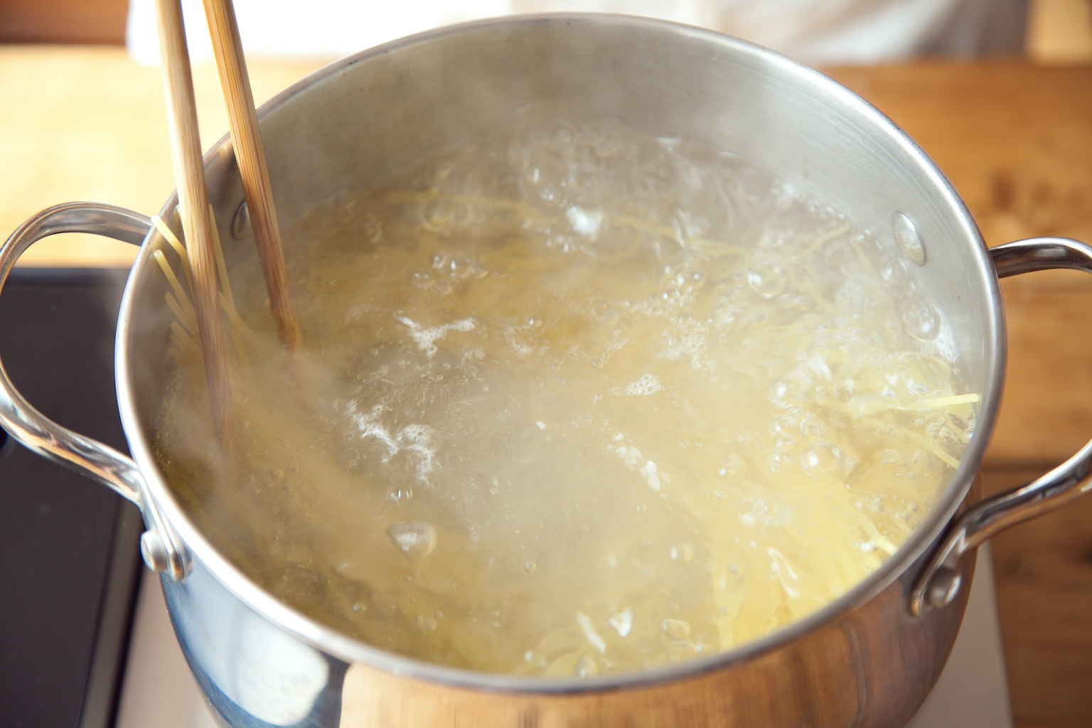 鍋にたっぷりの湯を沸かし、塩(分量外/水2リットルにつき大さじ1/2)を加える。