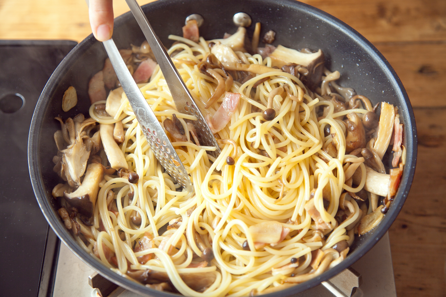 フライパンに湯を切ったスパゲッティ、残りのしょうゆを加え混ぜる。