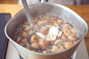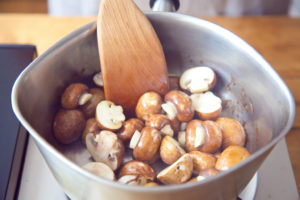 鍋にオリーブオイルを強めの中火で熱し、マッシュルームを1〜2分炒める。