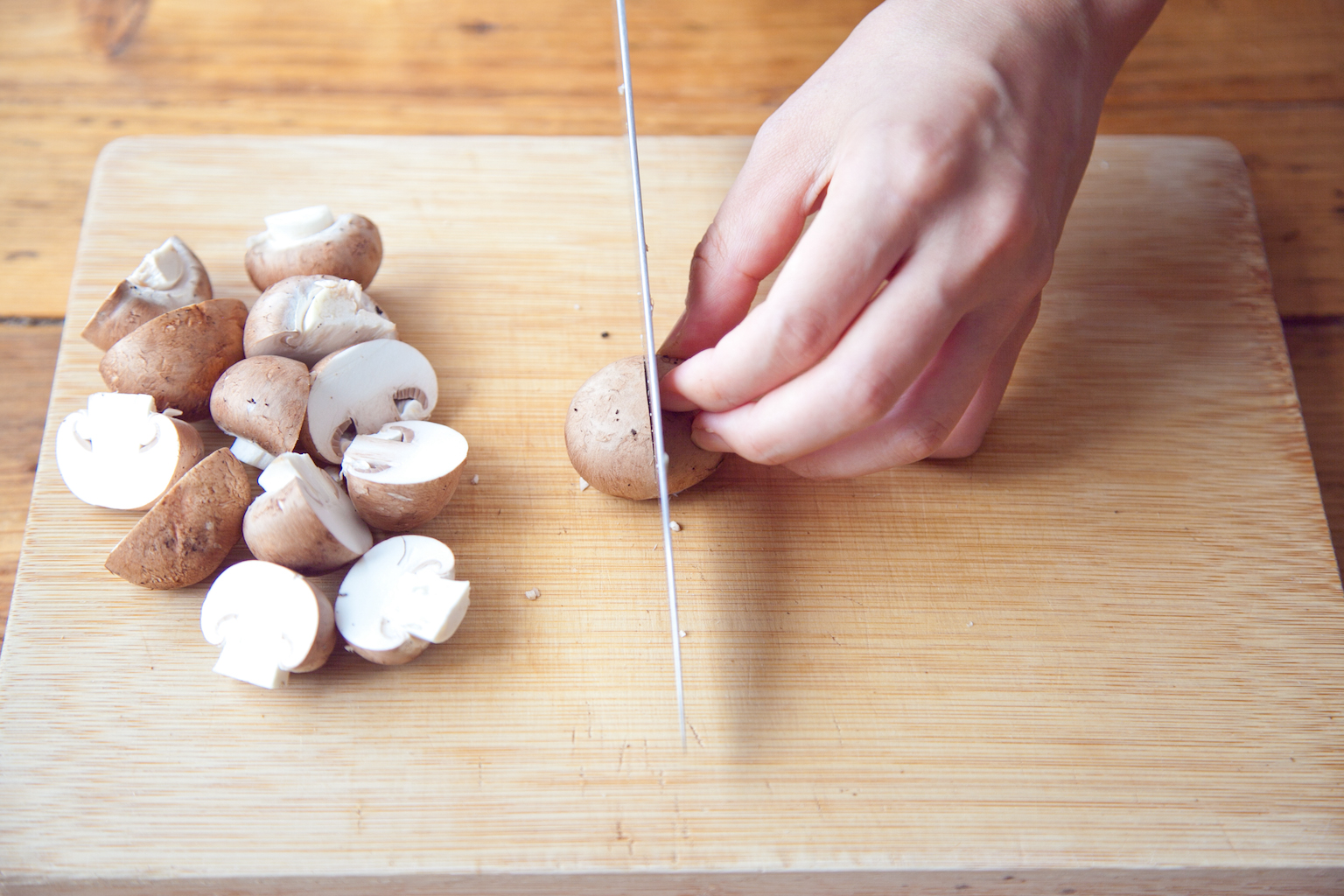 マッシュルームは硬い部分を切り落とし縦半分に切る。
