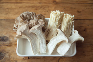 フライパンにオリーブオイルを強めの中火で熱し、きのこを入れる。