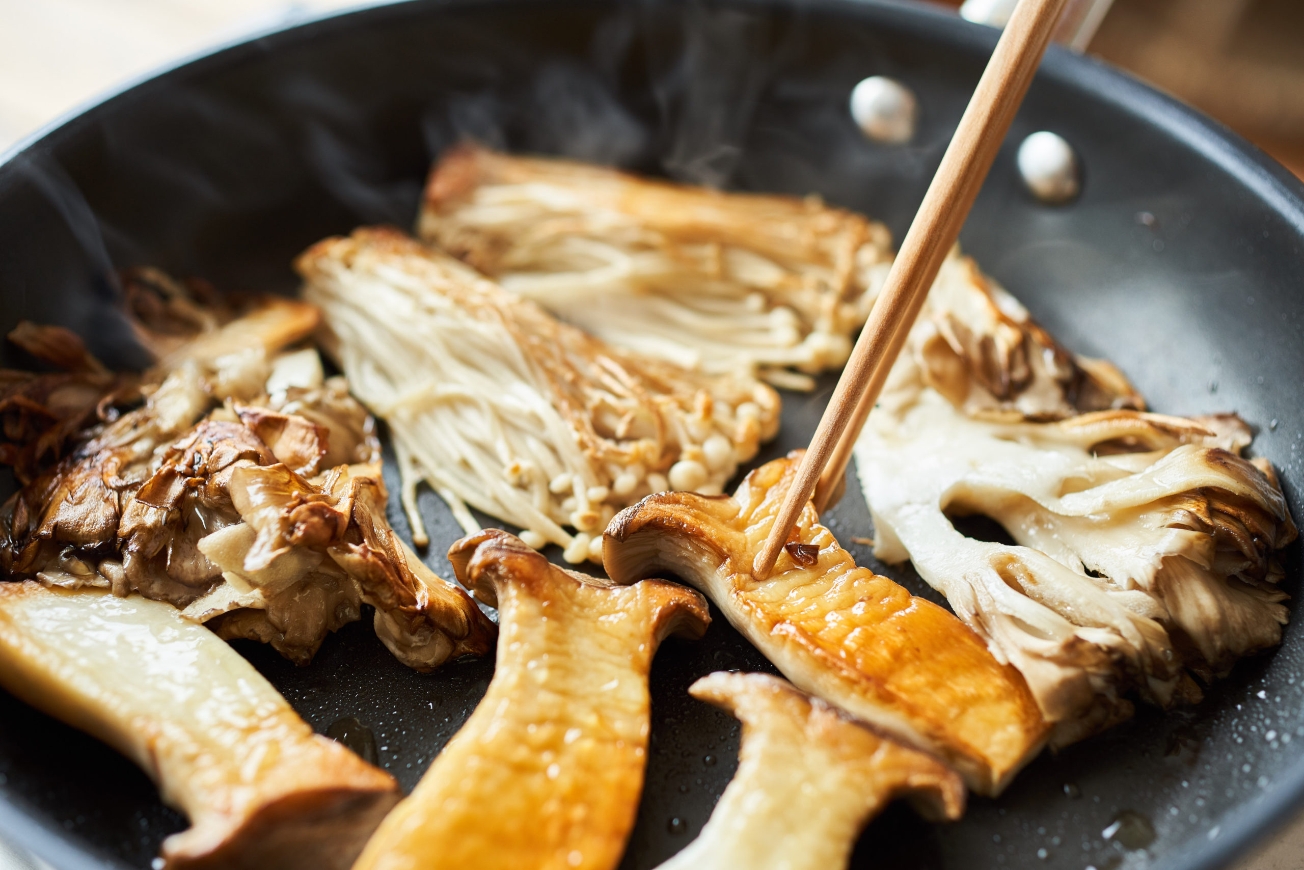 フライパンにオリーブオイルを強めの中火で熱し、きのこを入れる。