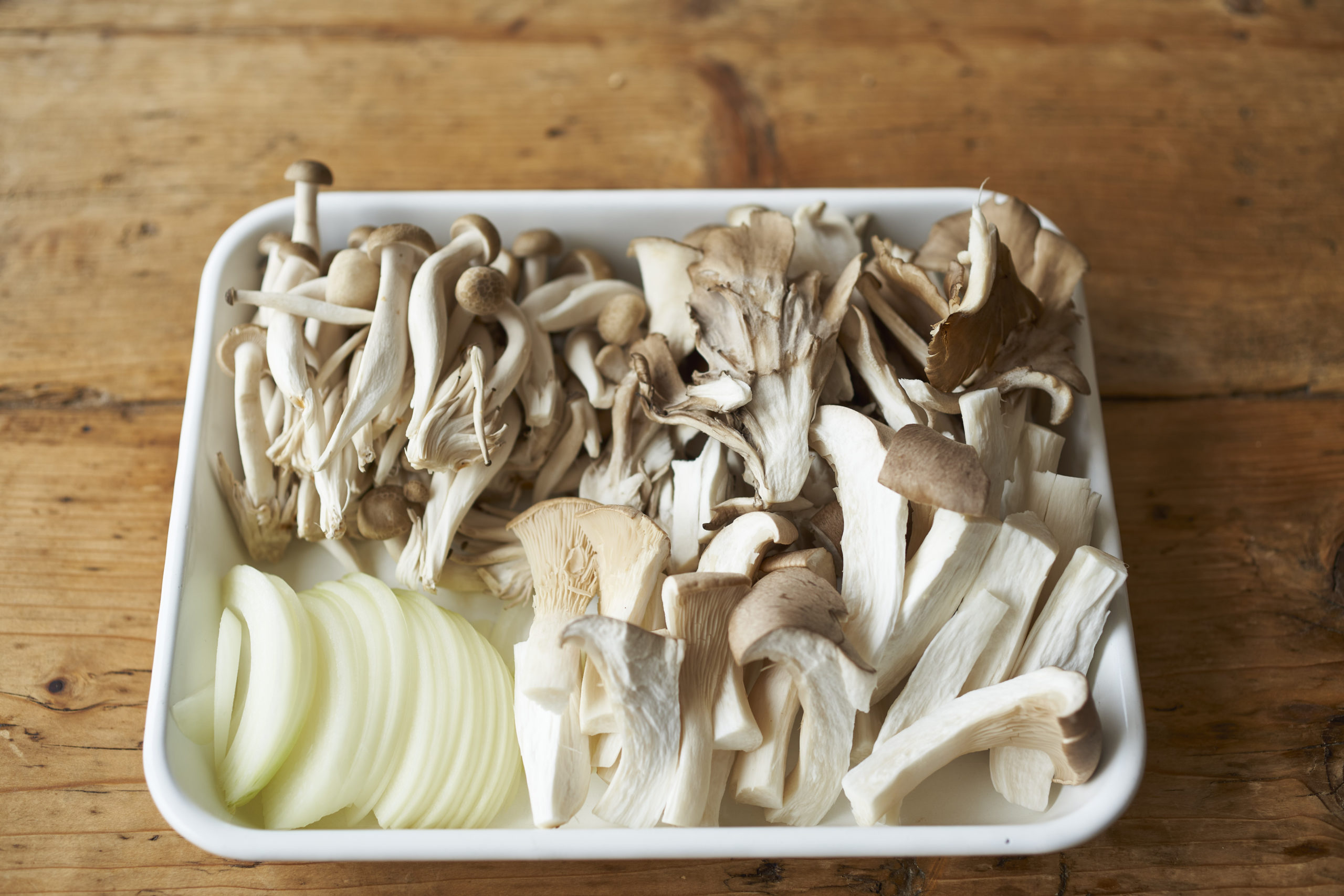 エリンギは長さを半分、縦にさく。舞茸は手でほぐす。