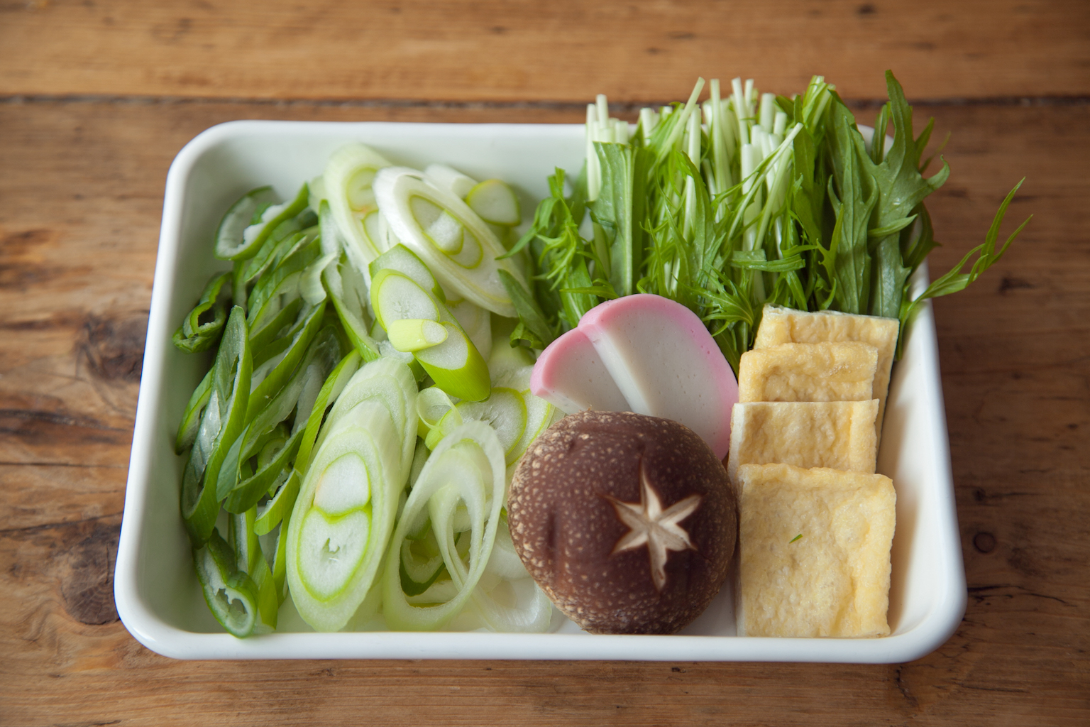 長ねぎは斜め薄切り、水菜は3〜4cm長さ、しいたけは軸を切り取り、