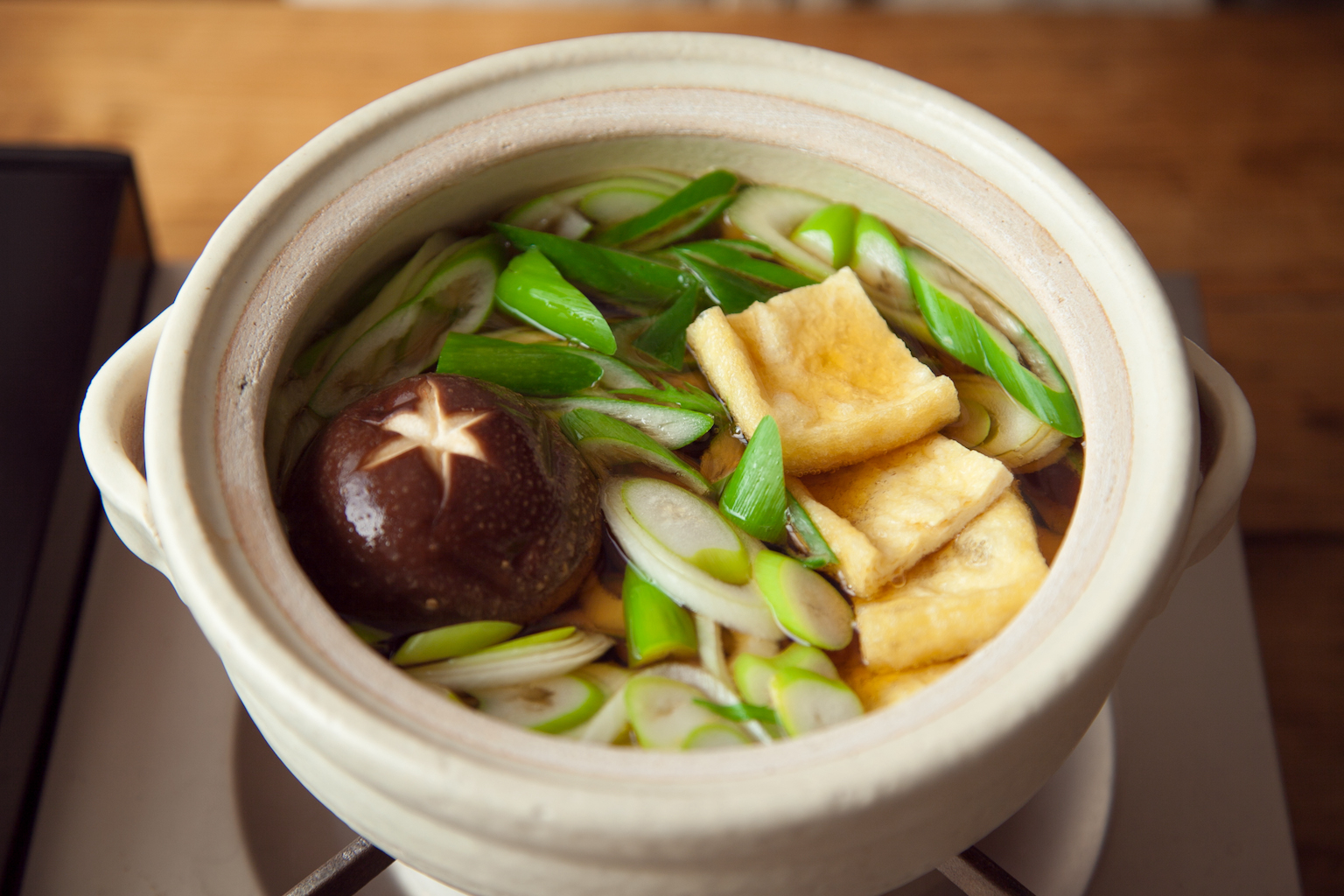 煮たったら長ねぎ、しいたけ、油揚げを入れて2〜3分煮る。