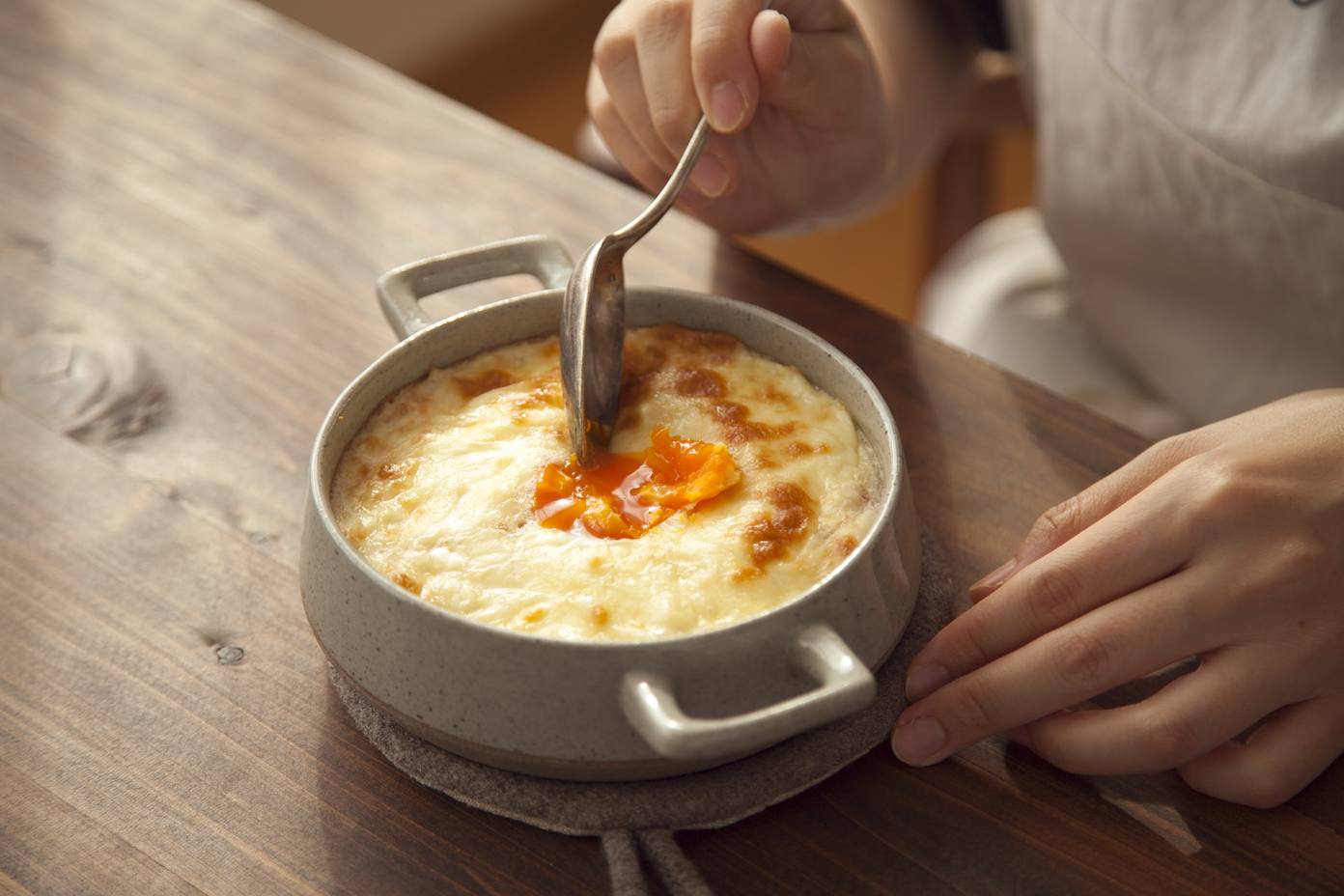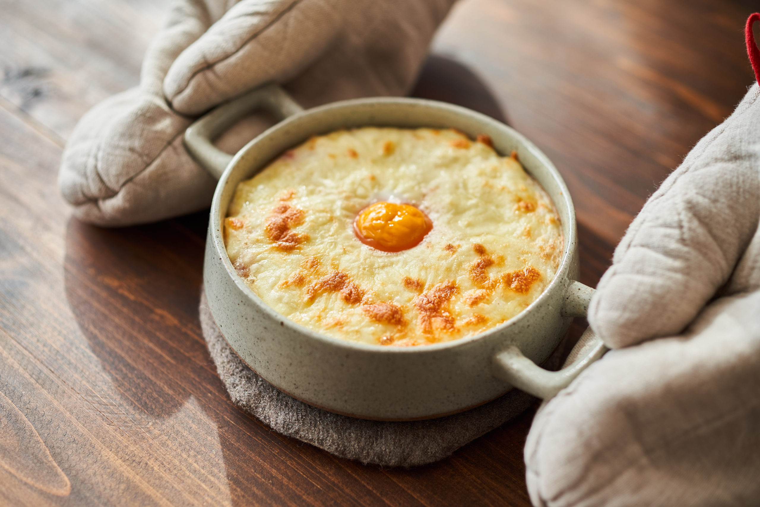 耐熱皿に3を入れ、ピザ用チーズを中心以外にかけ、中心に卵黄を入れる。