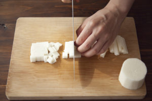 ベーコンは1cm四方に、長芋は半分は1cmの角切り、残りはすりおろす。