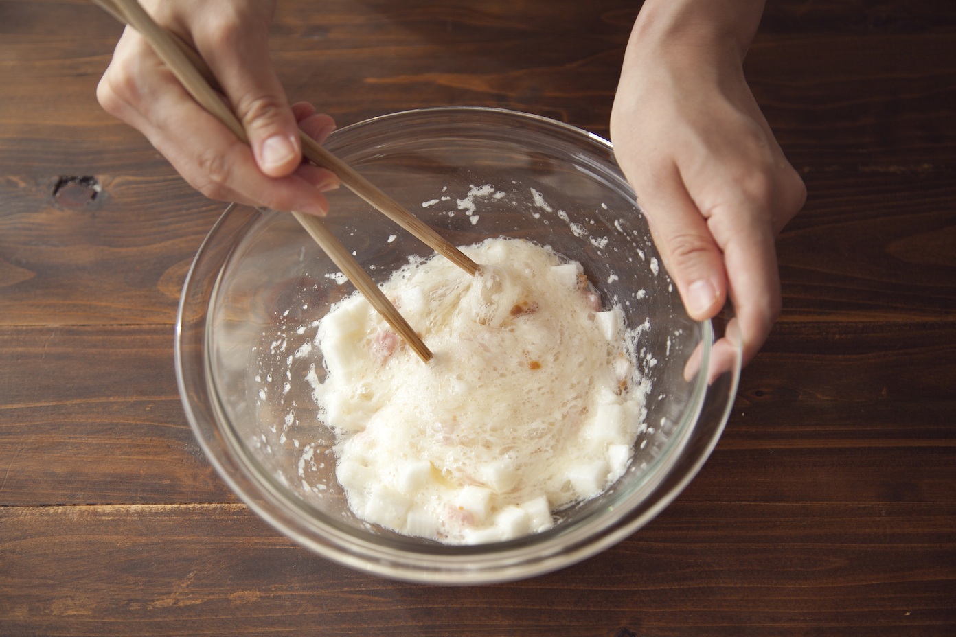 ボウルに長芋、みそを混ぜ、ベーコン、卵白を加えさらに混ぜる。