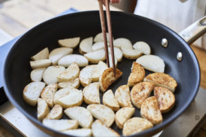 長芋は皮ごと1cmの厚さの半月切りにする。