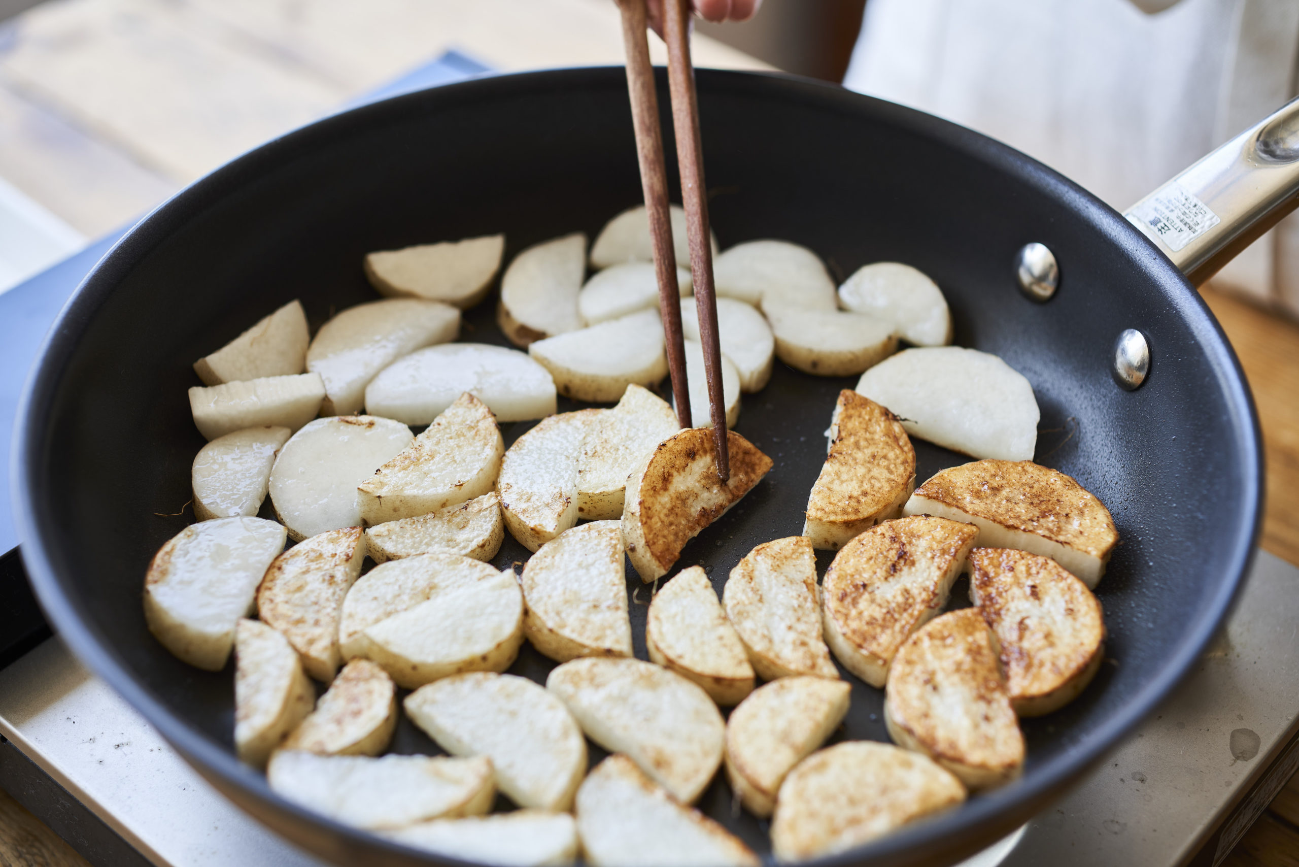 フライパンにサラダ油を中火で熱し、長芋を入れて片面2分ずつ焼き、両面焼き色をつける。