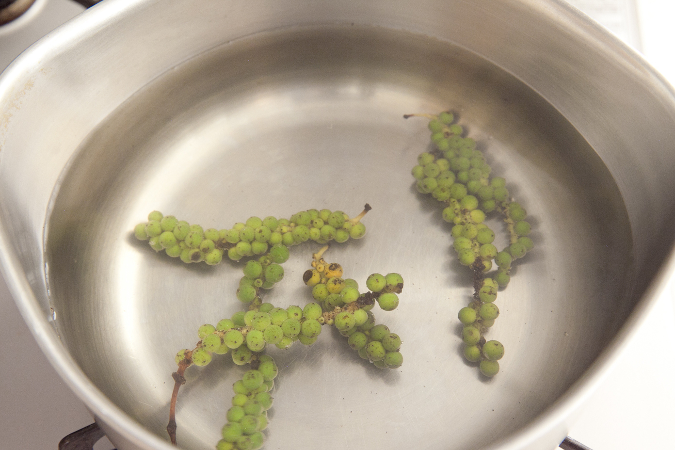 鍋に湯を沸騰させ、生こしょうを3分茹で、水気をよく切り、