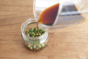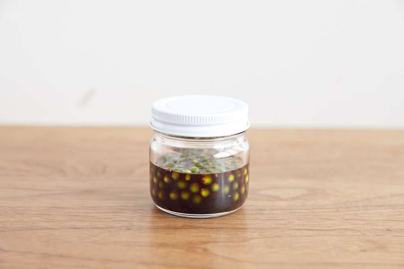 瓶に生こしょうを入れ、ひたひたになるまでしょうゆを入れる。